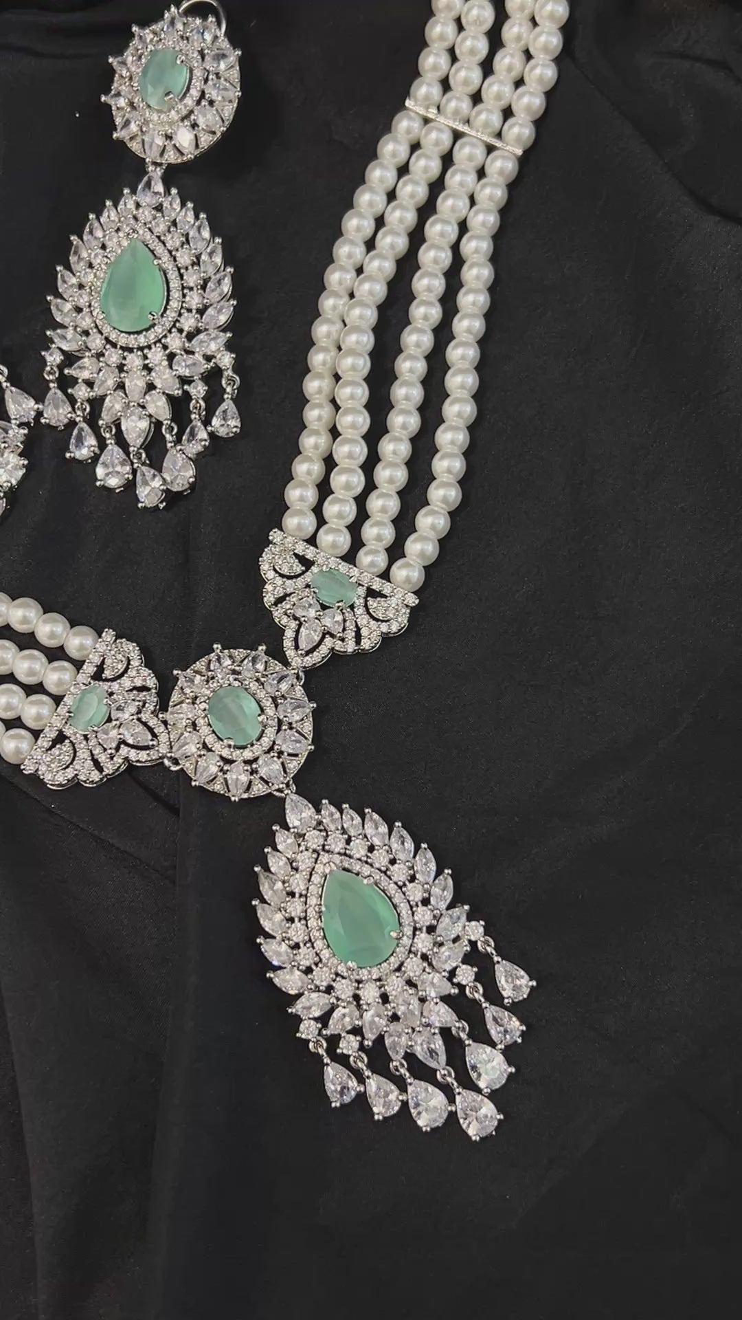 The Quzey AD black necklace set combines elegance with modern charm. Adorned with sparkling American diamonds and deep black stones, it exudes luxury and sophistication. The beautifully crafted necklace is paired with matching earrings, creating a balanced and graceful look. Perfect for weddings, parties, and formal gatherings, it adds a bold yet refined touch to any outfit. Designed with fine craftsmanship, it captures the essence of timeless beauty. The contrast of black and silver enhances its allure. A luxurious creation by Quzey for women who value elegance and style.